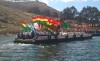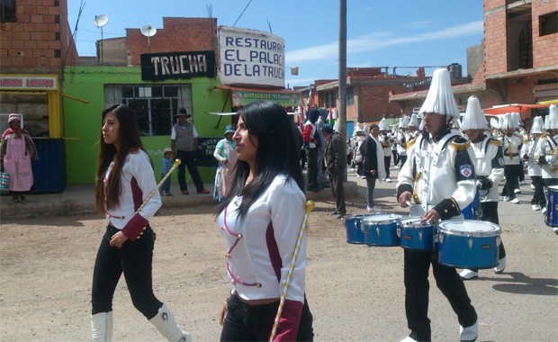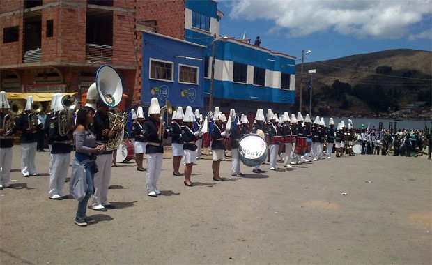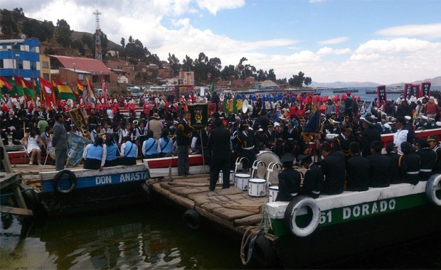 Este viernes, bandas de guerra de diferentes colegios, tanto de Bolivia como Perú, se reunieron en San Pedro de Tiquina, a orillas del lago Titicaca, para participar de un concurso. Los jóvenes músicos se subieron a botes para tocar sus melodías en medio del lago sagrado.