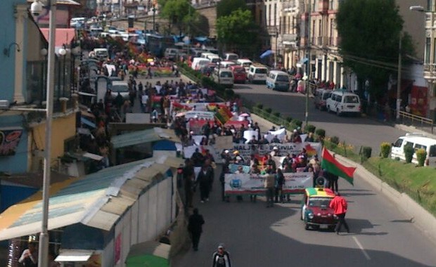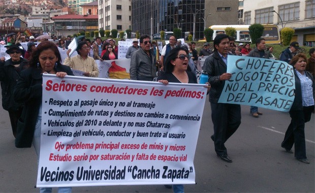 Cientos de vecinos de la ciudad de La Paz, encabezados por el Organismo de Control Social, marchan esta tarde en rechazo a la intención de los choferes de incrementar las tarifas.