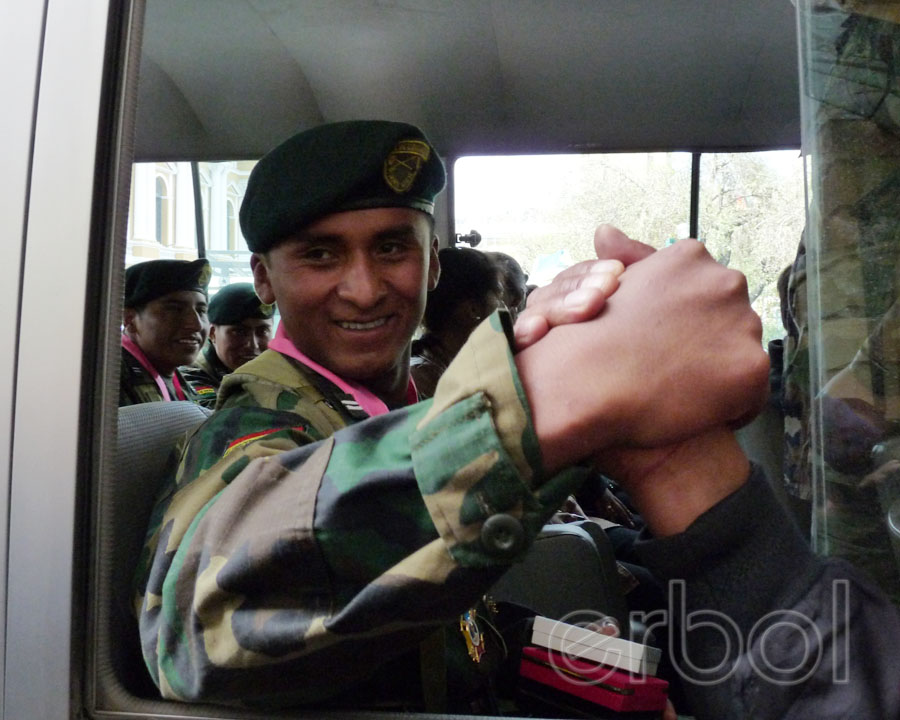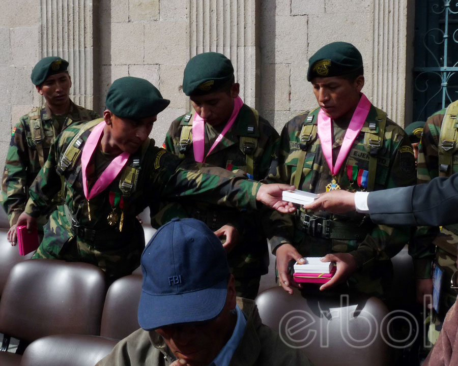 Los soldados Alex Choque Quispe, Augusto Cárdenas García, José Luis Fernández Choque, que estuvieron detenidos en Chile, fueron condecorados por el Gobierno Nacional con la medalla “Mariscal Andrés de Santa Cruz” en un acto celebrado en la Plaza Murillo.