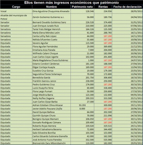 En esta lista aparecen seis senadores y 30 diputados. La situación más sorprendente la tiene la diputada masista María Magadalena Chuca, sus rentas multiplican en 187 veces a su patrimonio, que asciende a 1.000 bolivianos.