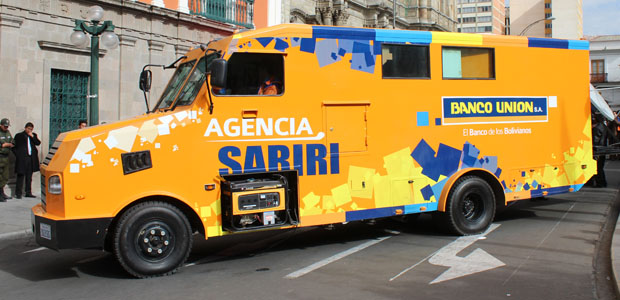 La agencia móvil del Banco Unión prestará servicios de cajas para depósitos y retiros de dinero hasta 50 mil bolivianos, compra y venta de moneda extranjera, pago del Bono Juana Azurduy de Padilla, la Renta Dignidad y otros; además de la cancelación de sueldos a funcionarios públicos.