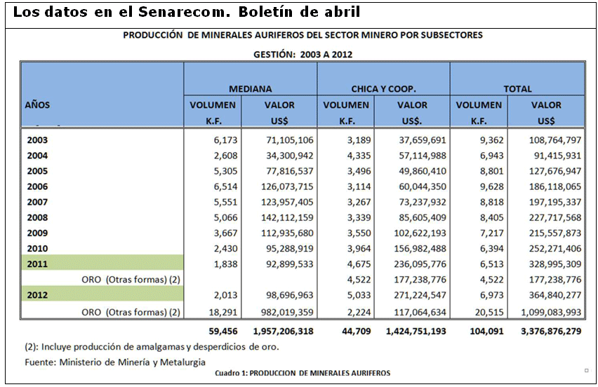 Y hasta en 280 Bs. en los alrededores de San Ramón, Santa Cruz, de acuerdo a informes de artesanos y consultas hechas esta semana, tras las tardías restricciones a la evasión de impuestos, una vez que el Estado se dio cuenta que la exportación de “desperdicios de oro y amalgamas” –20.5 toneladas (t.) equivalentes a 1.099 millones de dólares (MM/$us.) el 2012, de un total de 27.4 t.– no había pagado regalías por hasta 71 MM.