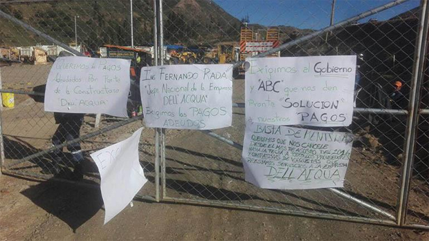 Los trabajadores contratados por la empresa venezolana Dell’Acqua para la construcción del tramo Epizana-Valle Hermoso en el departamento de Cochabamba, denunciaron este viernes que hace aproximadamente un año y dos meses que no cobran sueldos y que en similar situación se encuentran los obreros de las empresas subcontratistas, reportó radio Pío XXII de la red Erbol.