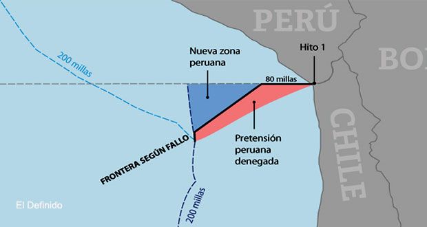 El tribunal internacional decidió establecer la nueva frontera marítima con Chile, extendiéndose desde el hito N°1, una línea paralela hasta las 80 millas marítimas, a partir de ese punto trazó una línea equidistante hacia el suroeste.