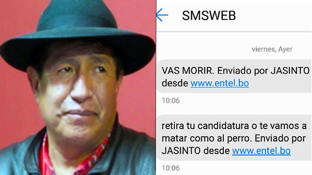 Entre los mensajes que recibió a su teléfono corporativo, están los siguientes: “Vas morir”, “retira tu candidatura o te vamos a matar como a perro”, “seguís jodiendo al presidente te vamos a colgar como al villarruel (en referencia al presidente Gualberto Villaroel, quien fue colgado en plaza Murillo)”.