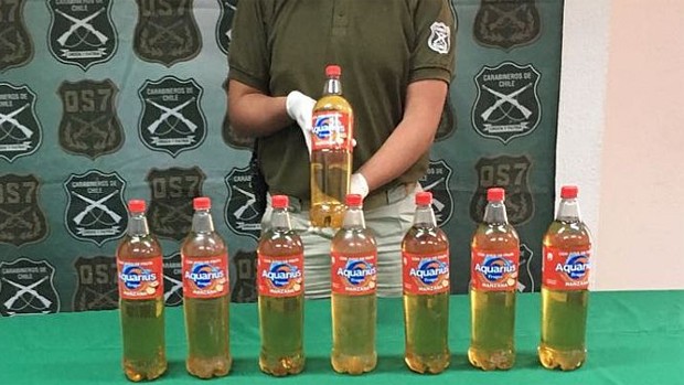 Los agentes chilenos hicieron la fiscalización de las botellas con la marca Aquarius y detectaron que su contenido era clorhidrato de cocaína en estado líquido.